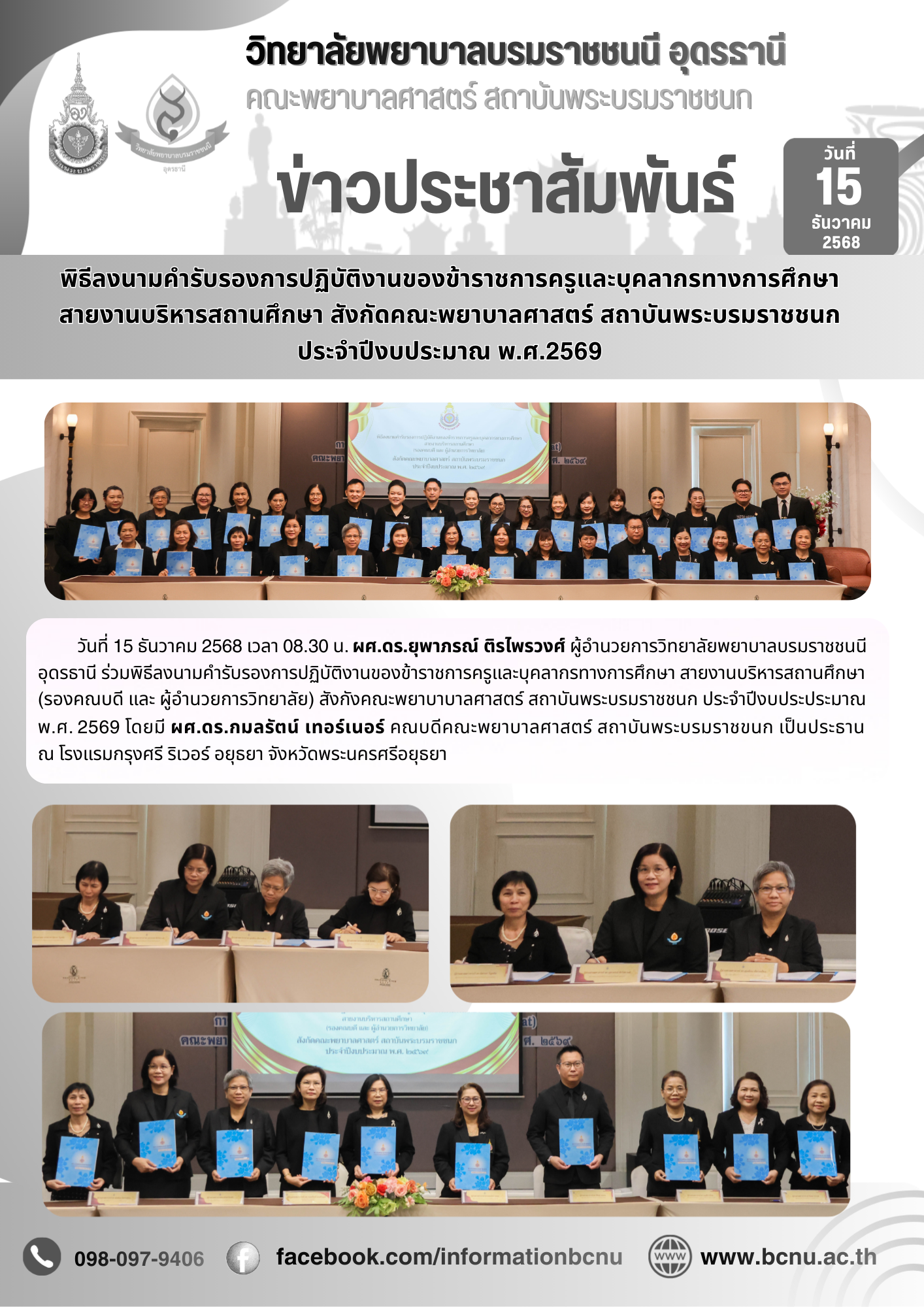 พิธีลงนามคำรับรองการปฏิบัติงานของข้าราชการครูและบุคลากรทางการศึกษา สายงานบริหารสถานศึกษา สังกัดคณะพยาบาลศาสตร์ สถาบันพระบรมราชชนก ประจำปีงบประมาณ พ.ศ.2569