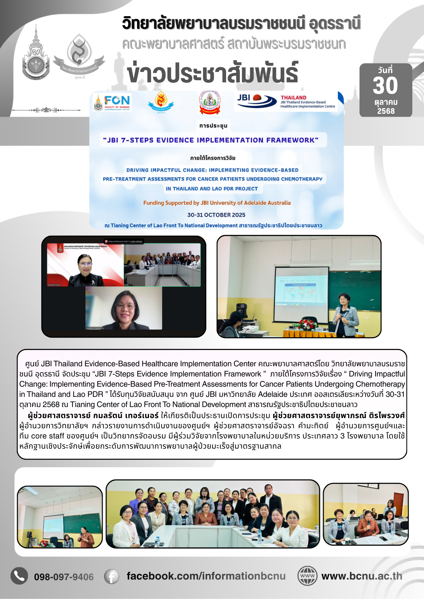 “JBI 7-Steps Evidence Implementation Framework ” ภายใต้โครงการวิจัยเรื่อง “ Driving Impactful Change: Implementing Evidence-Based Pre-Treatment Assessments for Cancer Patients Undergoing Chemotherapy in Thailand and Lao PDR ”